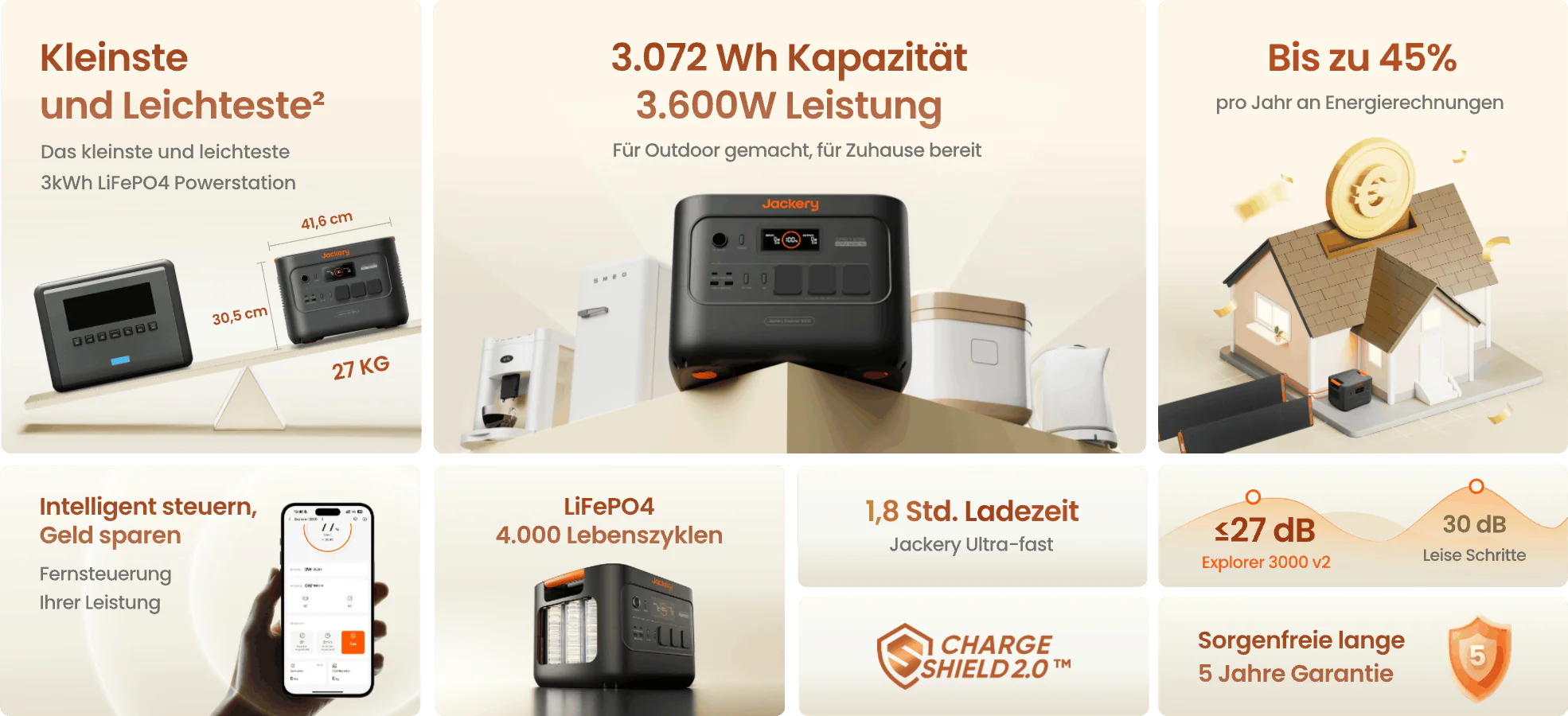 3.072 Wh KAPAZITÄT, 3.600 W AUSGANGDer Jackery Explorer 3000 v2 wurde für den netzunabhängigen und häuslichen Strombedarf entwickelt und bietet eine Kapazität von 3.072 Wh mit einer reinen Sinuswellenleistung von 3.600 W (7.200 W Surge) – genug, um Wasserkocher, Elektrowerkzeuge und andere Elektrogeräte im Freien zu betreiben. Es verfügt über 3x 230V~13A EU-Steckdosen, 2x 100W USB-C (für Laptops), 2x 18W USB-A und einen 12V⎓10A Carport zum gleichzeitigen Aufladen von Geräten, Elektronik und Campingausrüstung. Mit stabiler Stromversorgung für die meisten Bedürfnisse zu Hause und im Freien ist es Ihre All-in-One-Energielösung.